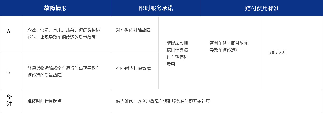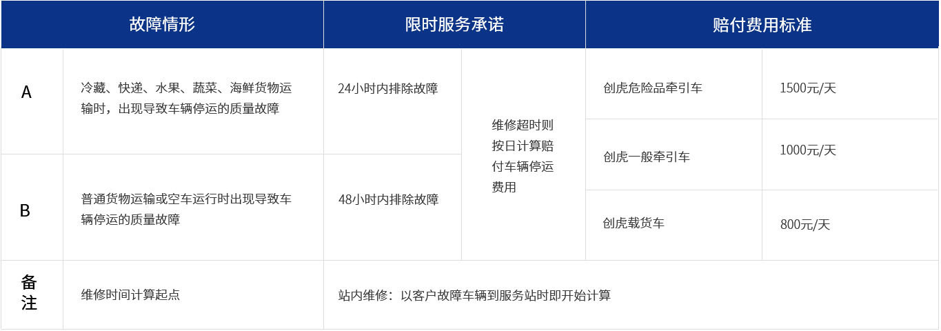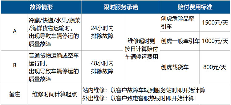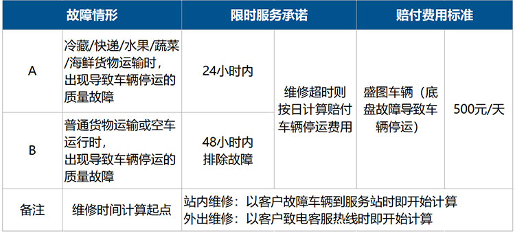 对牵引车/载货车48小时内无法排除故障,冷藏车、快递、水果/海鲜/蔬菜运输车辆24小时内无法排除故障时,可获得停运赔偿。
